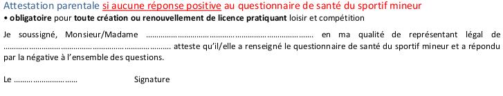 Attestation parentale, signée de la personne exerçant l’autorité parentale, précisant que chacune des rubriques du questionnaire de santé du sportif mineur a donné lieu à une réponse négative.
