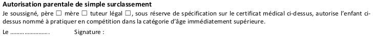 Surclassement : la présentation d'un certificat médical et d'une autorisation parentale est obligatoire pour pratiquer en compétition dans la ou les catégories d’âge supérieures.