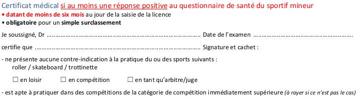 Dans le cas où une des rubriques du questionnaire de santé donne lieu à une réponse positive, un certificat médical de non contre-indication à la pratique de la ou des disciplines concernées datant de moins de six mois devra être présenté.