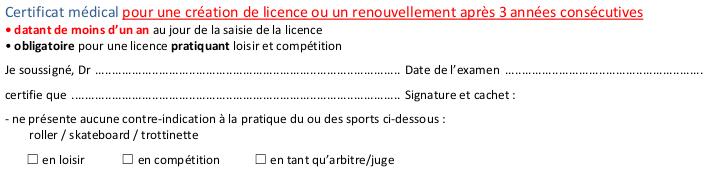 Certificat médical de non contre-indication à la pratique de l’une ou plusieurs des disciplines concernées datant de moins d’un an au jour de la saisie de la licence par le club.
